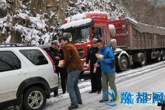 原来,11月22日,卢氏县境内普降大到暴雪,天气寒冷,道路积雪结冰,路面湿滑。恶劣天气造成了70余辆过境大货车被困于209国道王家河隧道周围积冰覆雪深山峡谷道路之中,为救助受困驾驶人,卢氏县公安局采购大量热豆浆、烧饼、纯净水等食品、饮料,送到了130多名受困驾驶人手里,对受困驾驶人进行慰问。